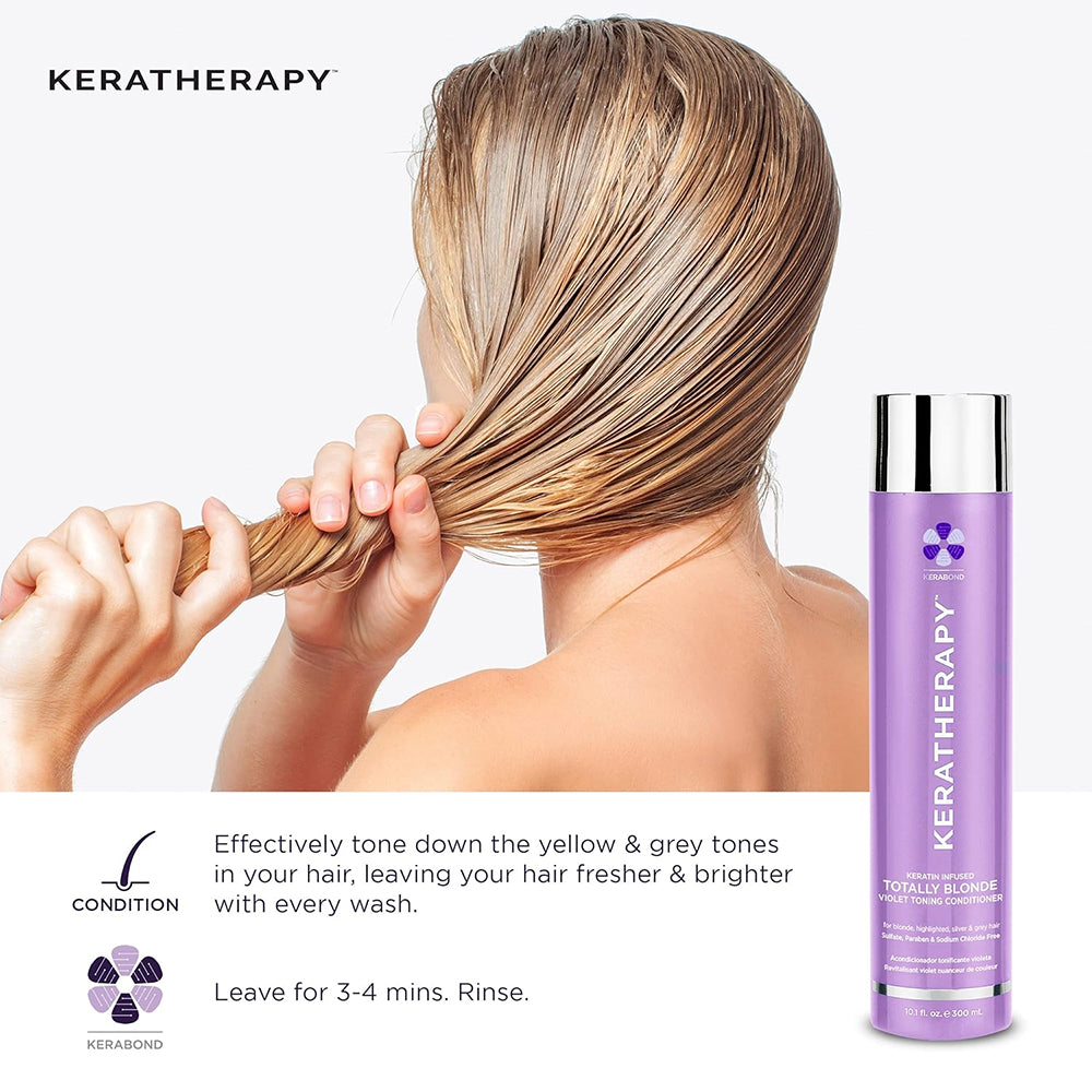 Refresh your blonde and restore softness with Keratherapy Keratin Infused Totally Blonde Violet Toning Conditioner. This deeply nourishing, violet-depositing formula tones brassy and yellow hues while replenishing moisture, sealing split ends, and strengthening the hair. Blonde, silver, and gray tones appear cooler, brighter, and beautifully healthy - without dryness or frizz.