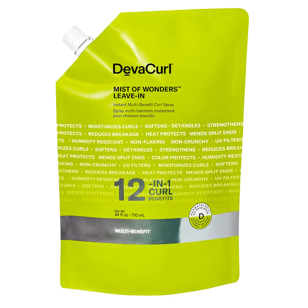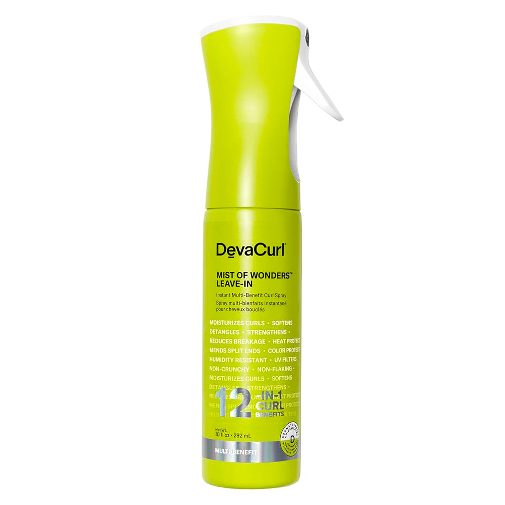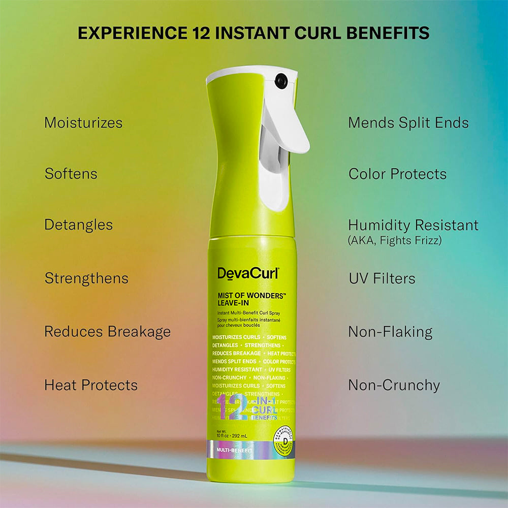 DevaCurl Mist of Wonders Leave-In delivers 12 targeted curl benefits in a single ultra-lightweight spray. Infused with Nutri-Curl Complex and UV technology, it moisturizes, detangles, strengthens, protects against heat up to 450°F, and helps defend color - all while leaving curls soft and frizz-free.