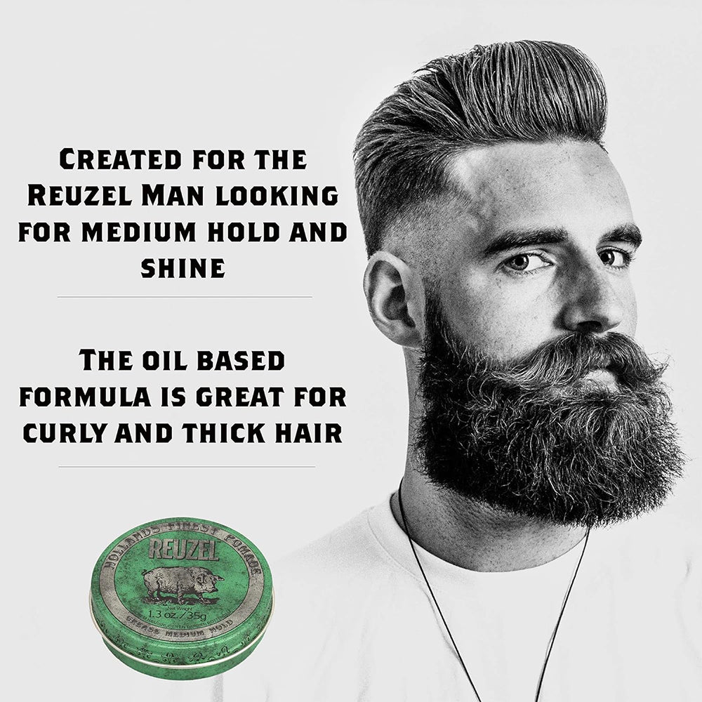 When your style demands control and shine that lasts, Reuzel Green Pomade Grease delivers a traditional oil-based formula with medium hold and natural shine. Infused with Beeswax and Tea Tree Oil, it softens coarse hair, controls unruly texture, and locks in moisture without the clumping of old-school greases.